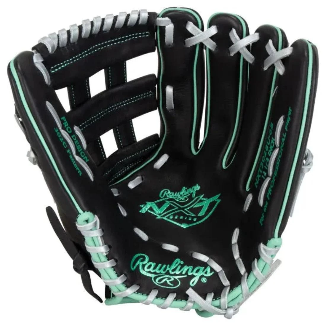 Prowl the field with the Rawlings NXT ContoUR 12.5-inch outfield glove. We designed and crafted this series for the typical travel ball player, as it features high-quality leather, making it easier to break in and shape the way you need it to! This 12.5-inch outfield glove sports a Pro-H web, allowing for quick transfers to throw out runners on the base paths. The 302U pattern provides fielders with a deep pocket and extension that is perfect for reeling in balls that may be out of reach. For added comfort of the glove, this entire collection reps the ContoUR fit, giving players with thinner hands a more secure fit. Additionally, there are padded thumb sleeves to help eliminate the sting of line drives hit your way. The colorway on this NXT infield glove sports a black shell with mint green stitching and piping. For added white accents, there is a white Rawlings patch and white laces. Bring some swagger into the outfield, thanks to the NXT series offering pro-style patterns, pro-web designs, and new colorways!